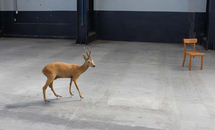 Chevreuil naturalisé / Chaise avec mouche dans un pied en résine – 2009