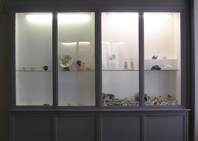 Dans deux grandes vitrines historiques du musée de la Céramique, utilisées une dernière fois ici, divers objets apportés rencontrent des objets des réserves du musée que le public n'a pas l'occasion de voir, normalement. Ainsi surgissent, entre eux, des analogies, des images, des histoires, des conversations.