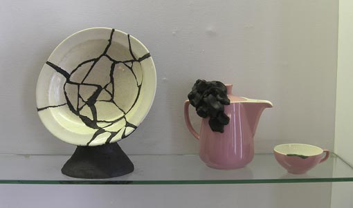 Asiette cassée (Maastricht, 1941) avec pâte à modeler – 2010 / Service Melitta (Allemagne, années 50), cafétière avec pâte à modeler et tasse avec chewing-gum – 2010