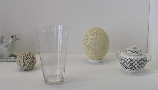 Boite à épices en faïence (Italie, 18. siècle) / pelote – 1994 / verre gravé – 2008 / œuf d'autruche perforé – 2002 / pot à sucre en porcelaine (Sèvres, 1944)