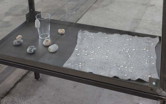 Glas mit Kunststein, Kunstharz in Kieselsteinen – 2011 / Silbertropfen auf Putzlumpen – 2013