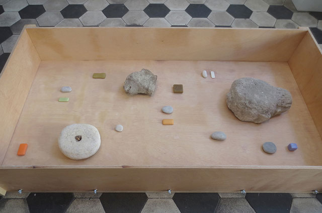 Deux fragments de sculpture érodés et une meule de la collection du musée, galets, savons usés, coffre en bois