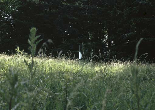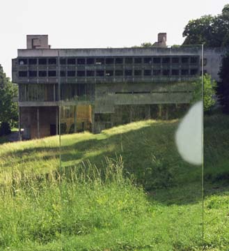 Une vitre de la taille d'une porte se dresse dans le pré au-dessus du Couvent de La Tourette. Sur cette membrane transparente, l'architecture, vue par reflet ou par transparence, selon le point de vue, se fond dans le paysage qui l'entoure et devient image. Sur le bord de la vitre on aperçoit une tache mate, comme si le souffle d'un spectateur s'y était posé un moment. |