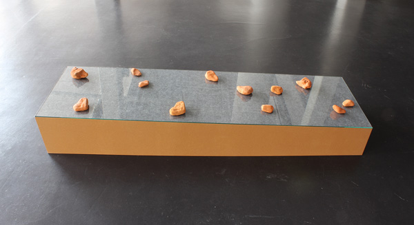 Briques arrondies dans la rivière, leurs doubles modelés en terre cuite, vitre, feutre, socle en médium avec une pente de 2° - 2017