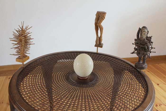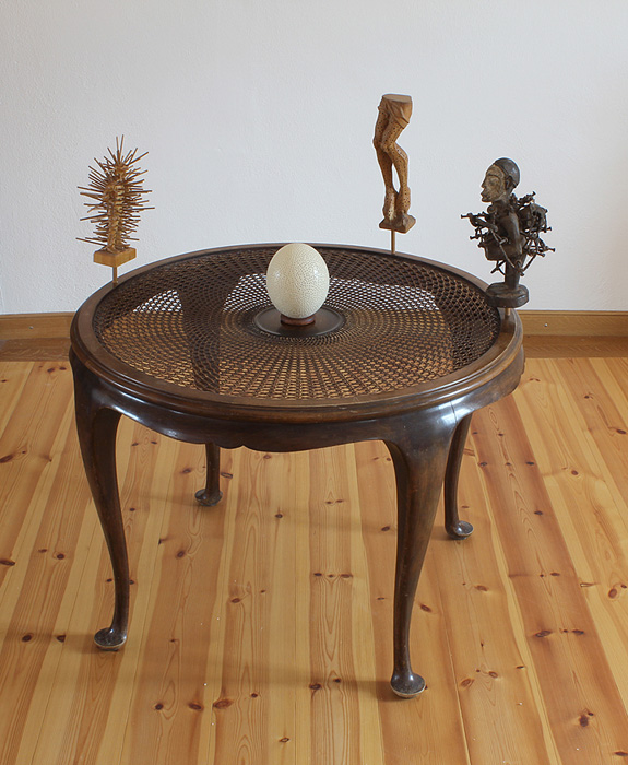 Trois figures en bois, œuf d'autruche, table en bois et vannerie – 2015