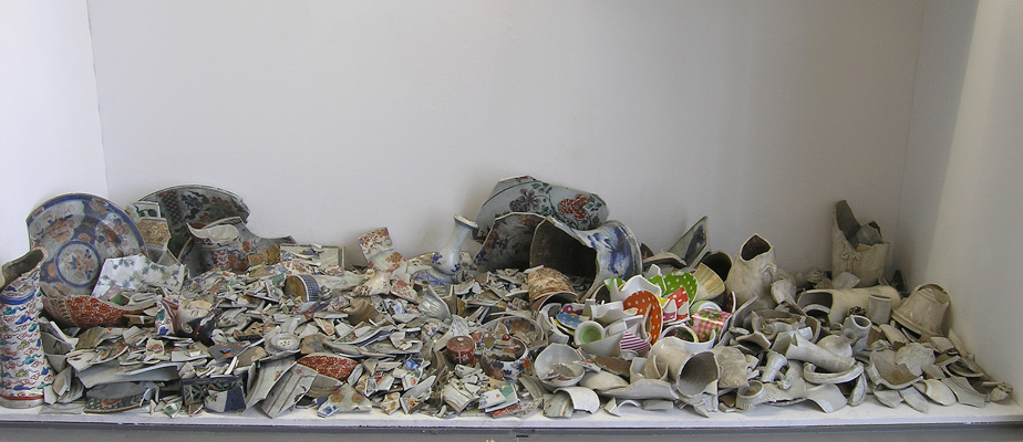 Tessons d'un accident de cuisine (2010) dans les tessons du bombardement du musée de Sèvres par les alliés (1942) et un flacon en forme de pied, faïence (Angleterre, 19e siècle)